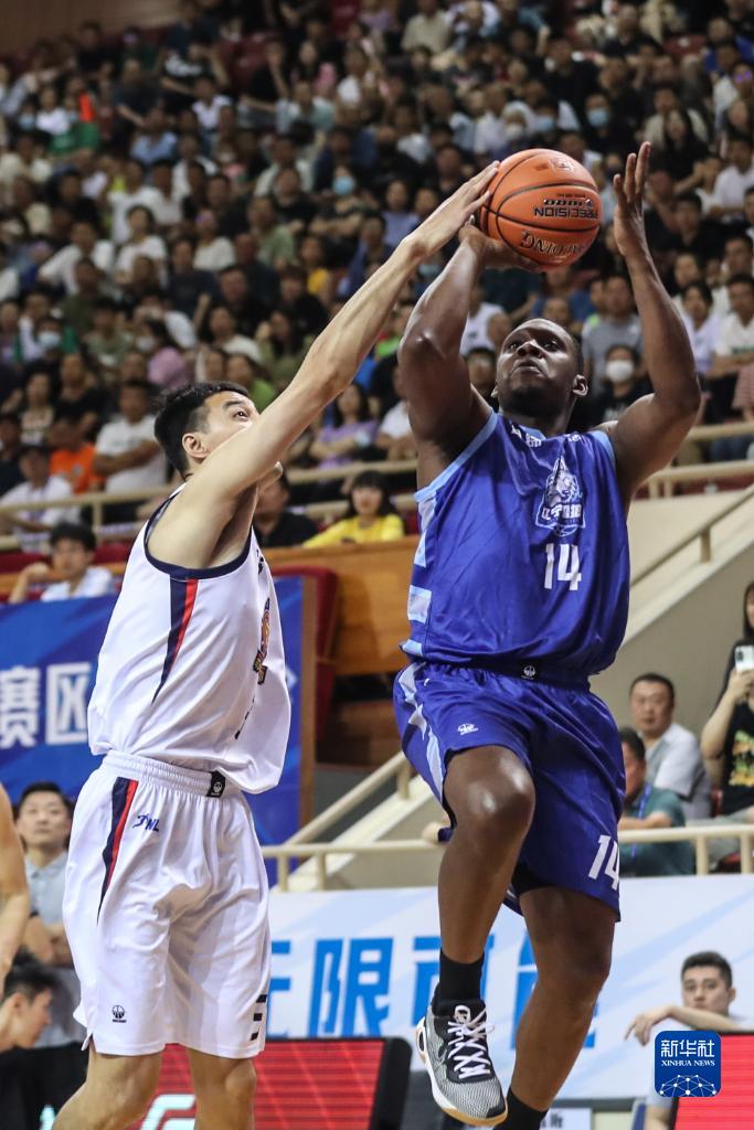 7月16日,辽宁益胜雪狼队球员哈德森(右)在比赛中投篮。新华社记者 潘昱龙 摄