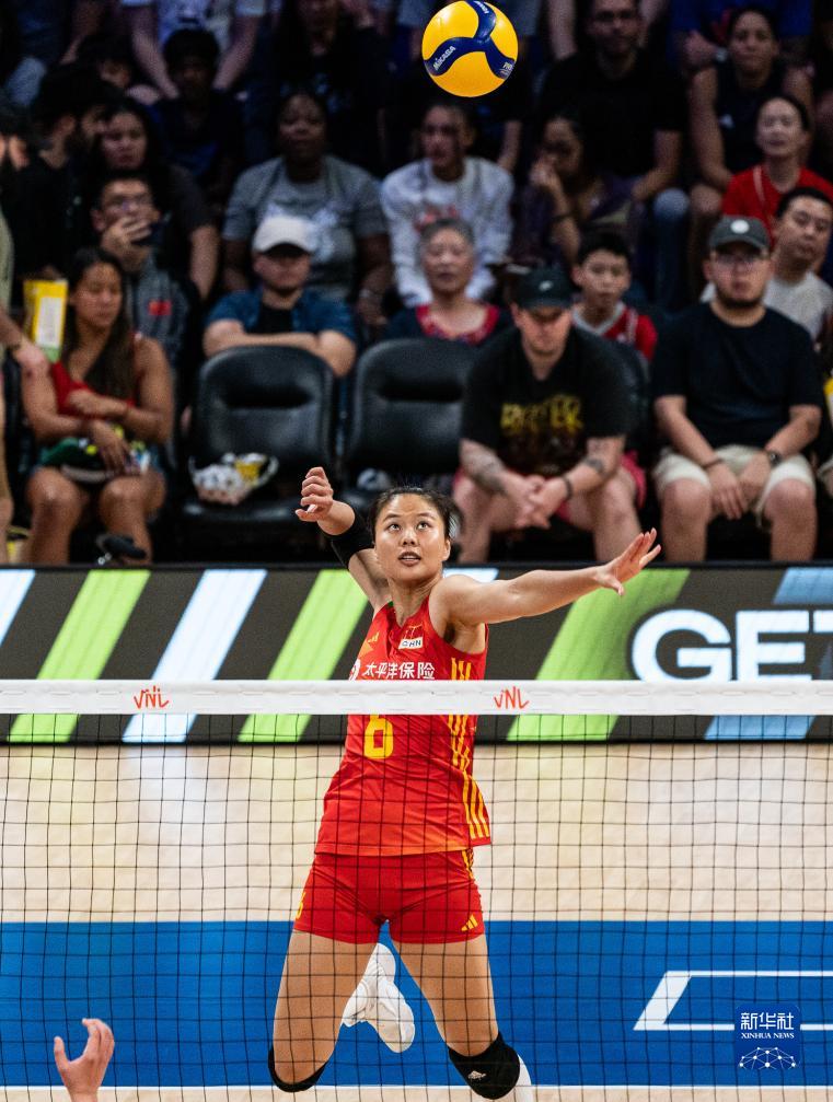 7月16日,中国队球员袁心玥(左一)在比赛中扣球。新华社发(陈晨摄)