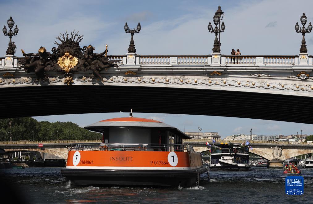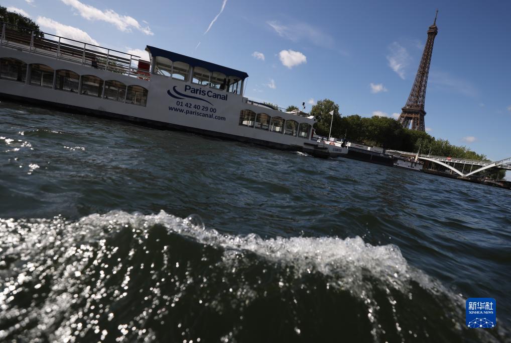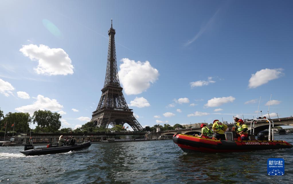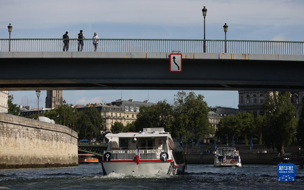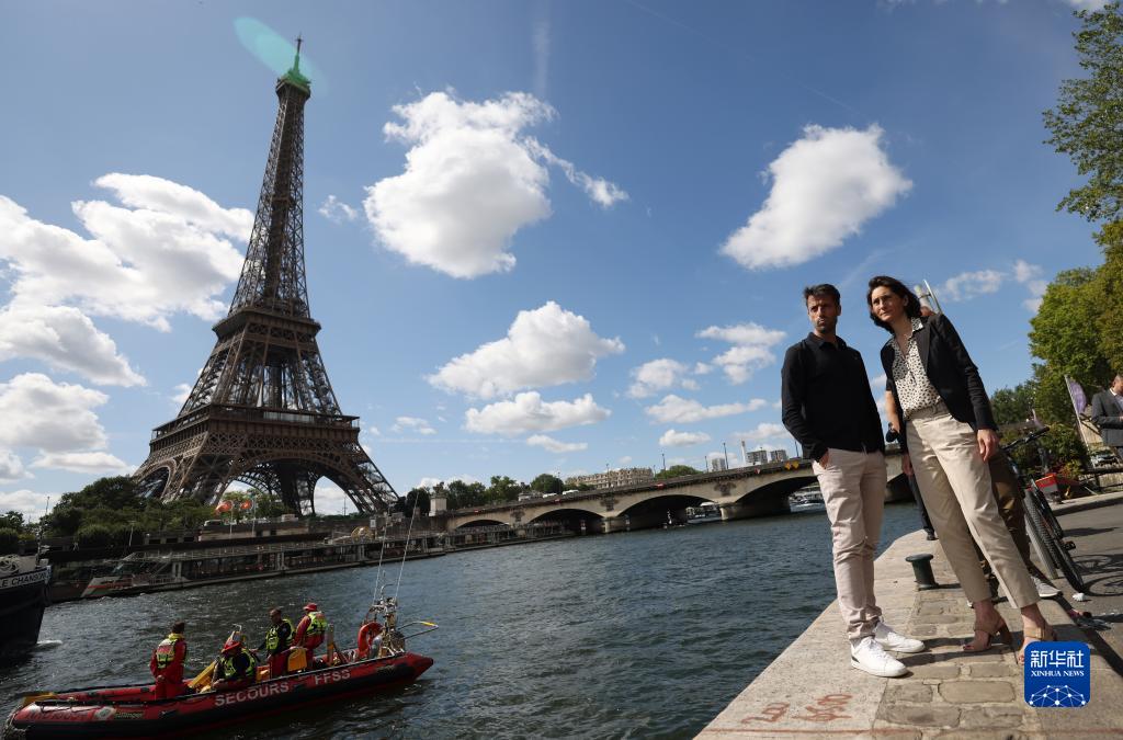 7月17日,法国体育部长卡斯特拉(右)与巴黎奥组委主席埃斯坦盖在岸边观看彩排。新华社记者高静摄