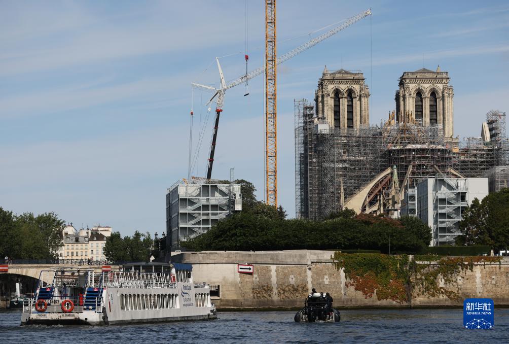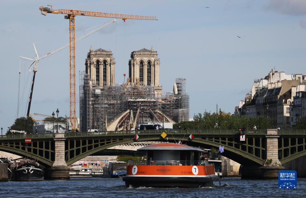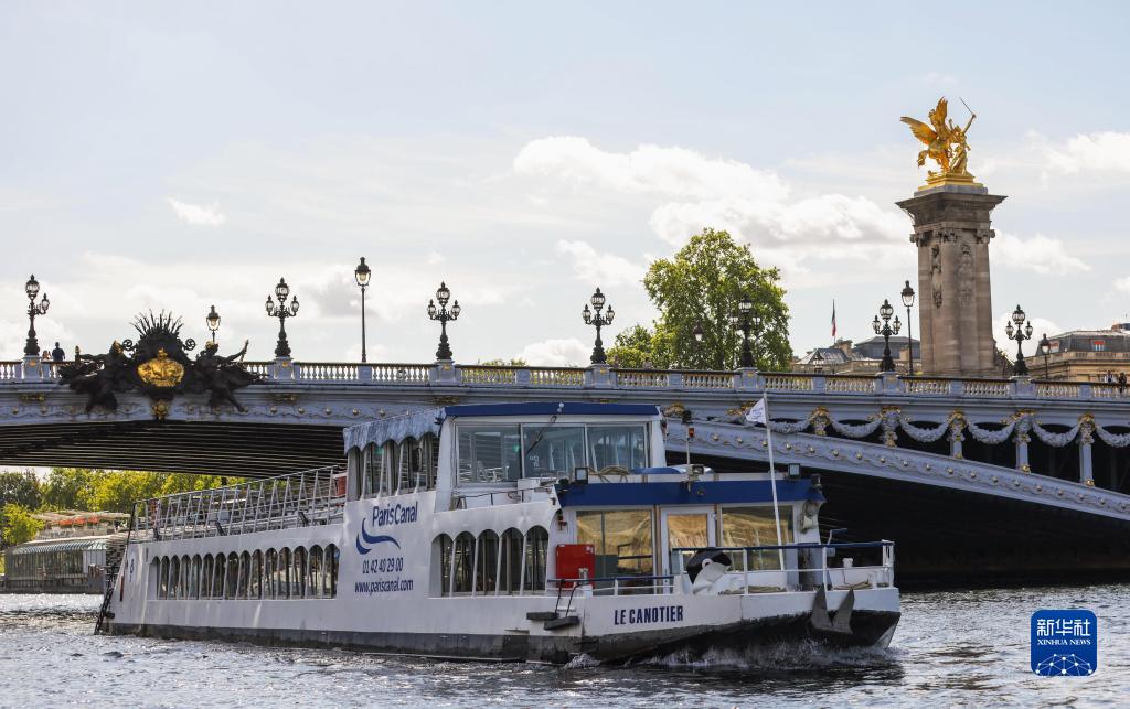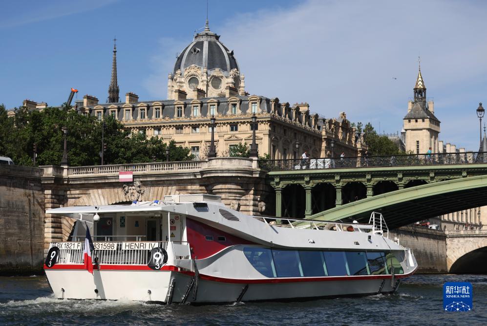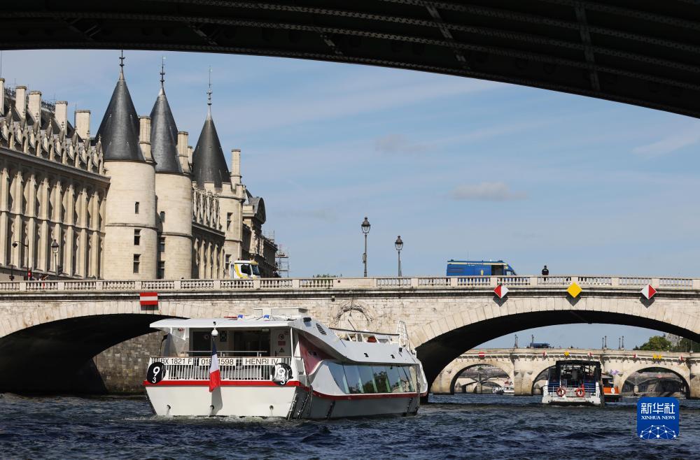 7月17日,法国体育部长卡斯特拉(右)与巴黎奥组委主席埃斯坦盖在岸边观看彩排。新华社记者高静摄