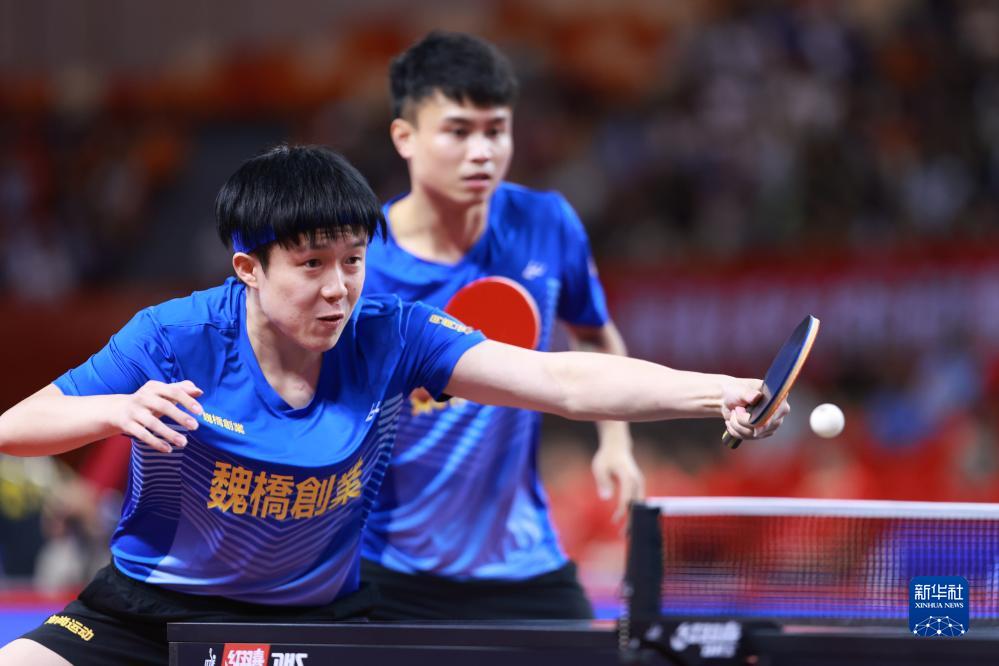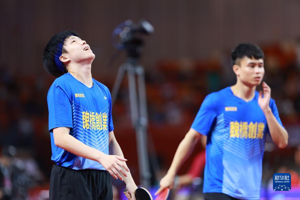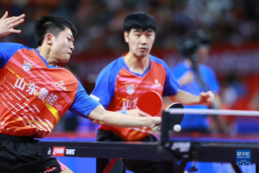 7月19日,山东魏桥队组合王楚钦(左)/周启豪在比赛中,他们以3比2战胜山东鲁能队组合闫安/袁励岑。最终山东魏桥队以3比2战胜山东鲁能队。新华社记者 刘续 摄