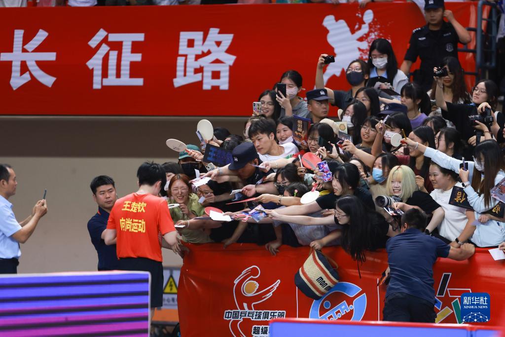 7月20日,山东魏桥队选手王楚钦在比赛后为观众签名,他以3比0战胜乐旋体育集团队选手赛林威。最终,山东魏桥队以3比0战胜乐旋体育集团队。新华社记者 刘续 摄