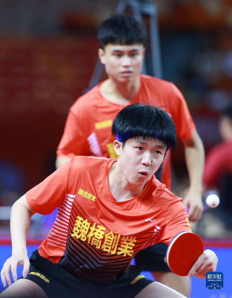 7月20日,山东魏桥队组合王楚钦(前)/周启豪在比赛中,他们以3比1战胜乐旋体育集团队组合高杨/赛林威。最终,山东魏桥队以3比0战胜乐旋体育集团队。新华社记者 刘续 摄