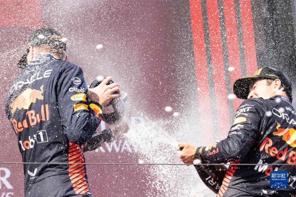 7月23日,红牛车队荷兰车手维斯塔潘(左)和队友墨西哥车手佩雷兹在颁奖仪式上庆祝。新华社发(弗尔季·奥蒂洛 摄)