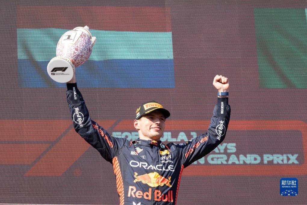7月23日,红牛车队荷兰车手维斯塔潘在颁奖仪式上庆祝夺冠。新华社发(弗尔季·奥蒂洛 摄)