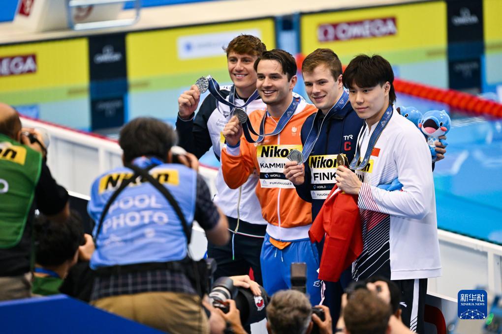 7月24日,覃海洋(右一)与三位并列亚军美国选手芬克、荷兰选手坎明加、意大利选手马丁嫩吉(从右至左)在颁奖仪式后合影。新华社记者 张笑宇 摄