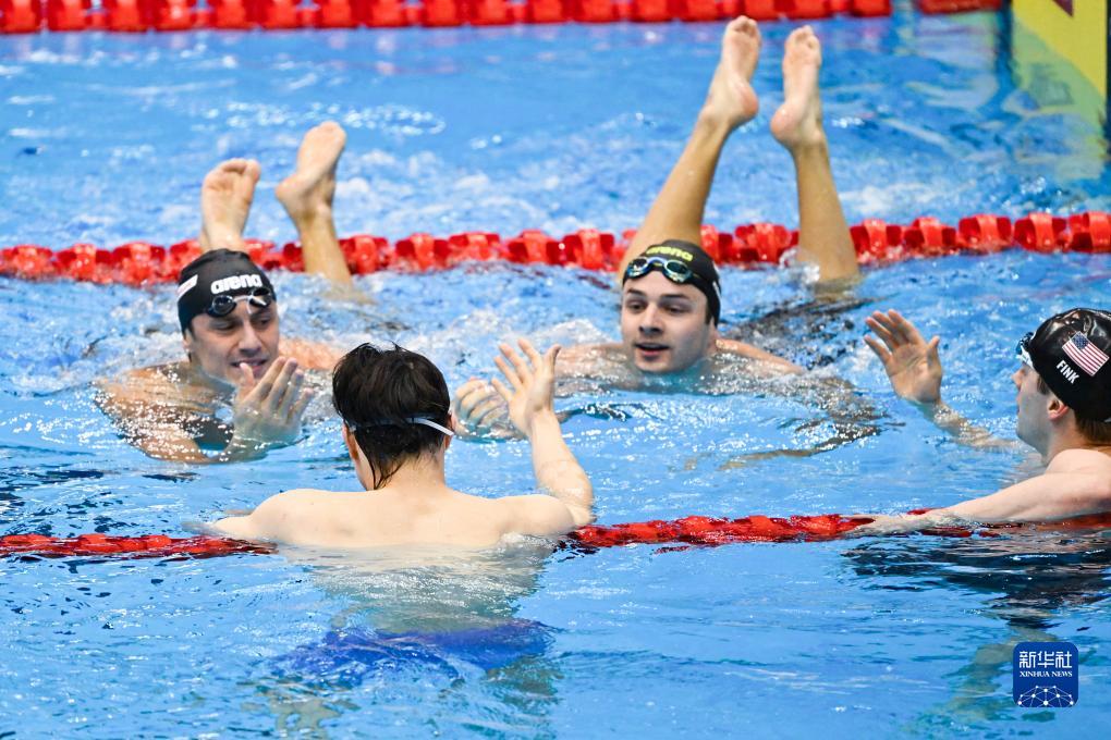 7月24日,覃海洋(左二)在决赛后接受祝贺。新华社记者 张笑宇 摄