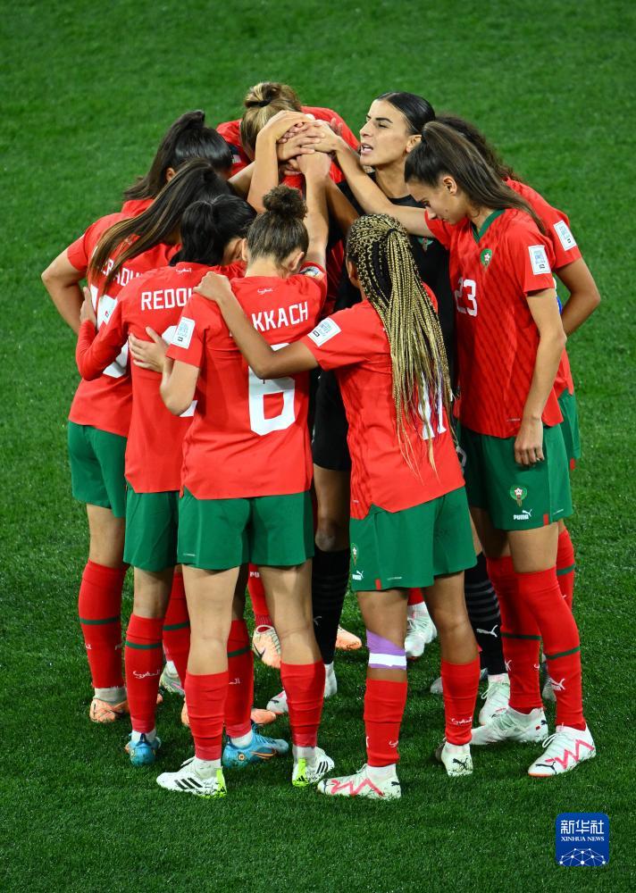 7月24日,摩洛哥队球员在比赛前互相加油。新华社记者 李一博 摄