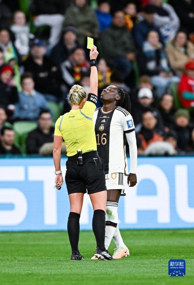 7月24日,德国队球员安约米(右)被出示黄牌。新华社记者 毛思倩 摄