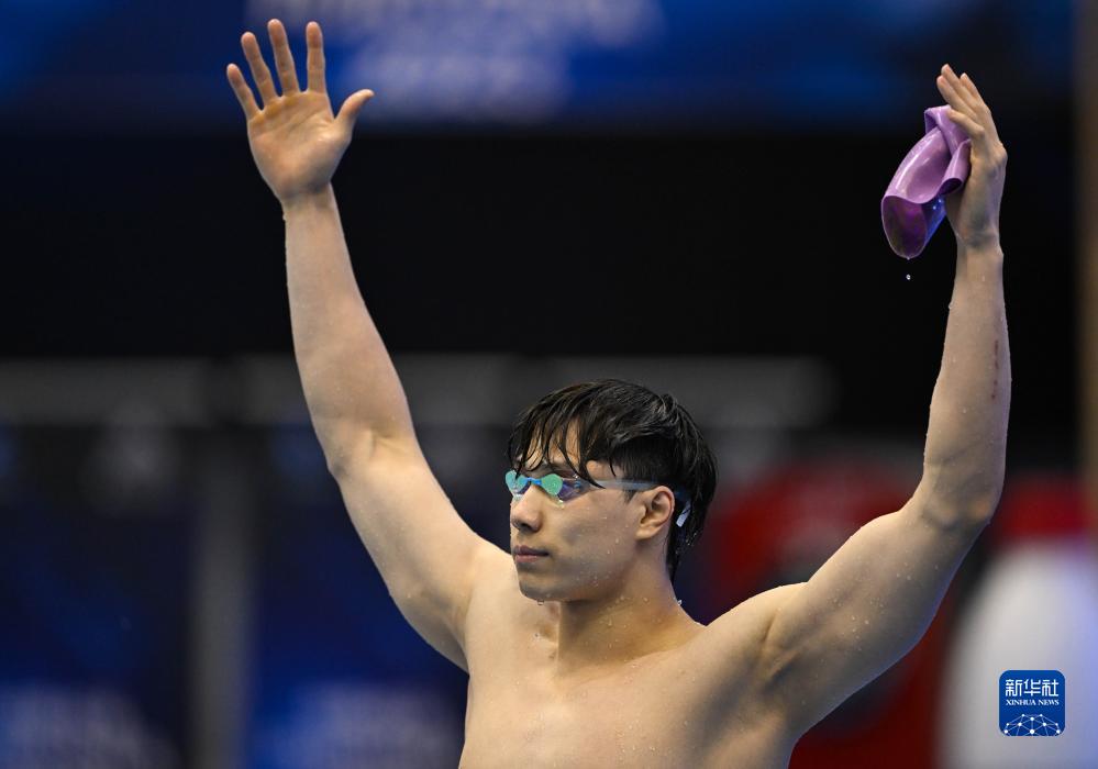 7月26日,覃海洋在决赛后庆祝。当日,在日本福冈举行的2023年世界游泳锦标赛男子50米蛙泳决赛中,中国选手覃海洋以26秒29的成绩夺得冠军。新华社记者 夏一方 摄