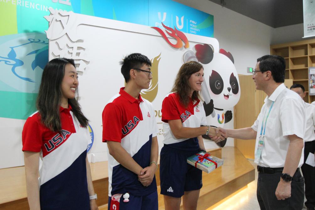 揭幕仪式上,陈杰向三位美国代表团成员赠送《大运中文100句》和《成都最美百首古诗词》。仪式后,与会嘉宾现场参观体验了中文学习区的互动项目。