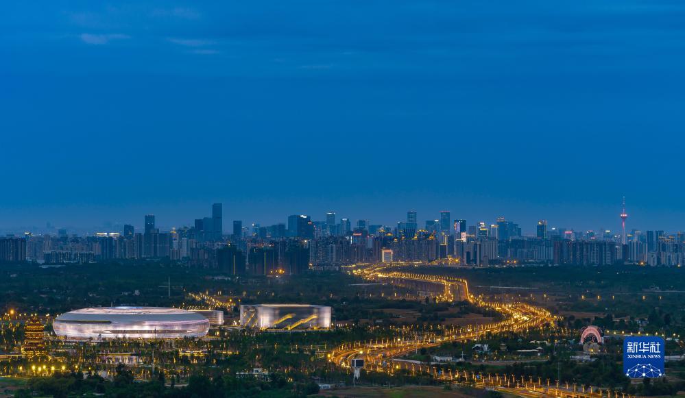 从龙泉山俯瞰夜幕下的东安湖体育公园(7月23日摄)。新华社发(廖铁军摄)