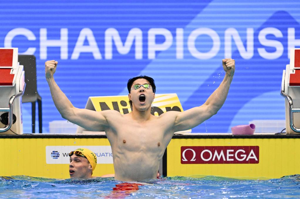 7月28日,覃海洋在决赛后庆祝。当日,在日本福冈举行的2023年世界游泳锦标赛男子200米蛙泳决赛中,中国选手覃海洋以2分05秒48的成绩夺冠,并打破该项目世界纪录。新华社记者张笑宇摄