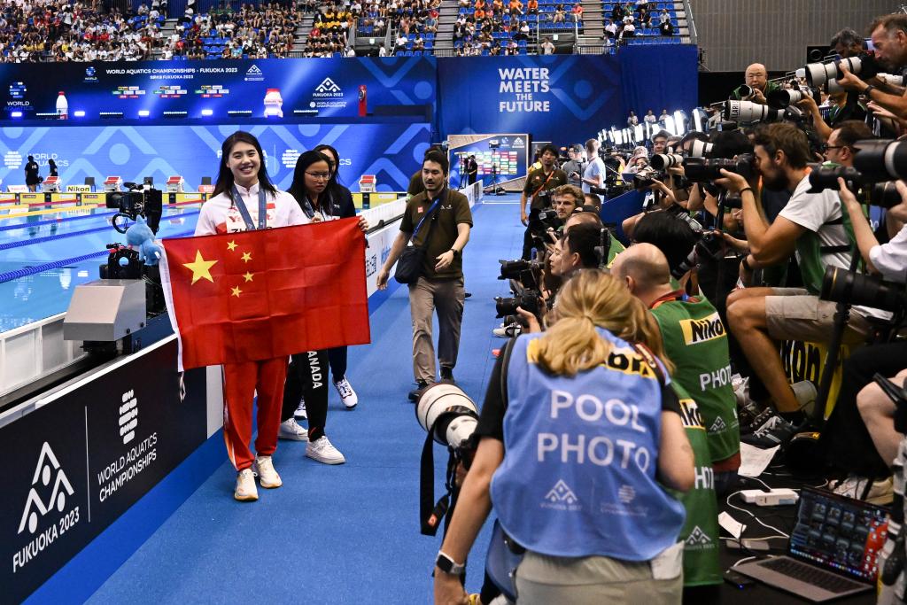 7月24日,张雨霏(左)在颁奖仪式后。当日,在日本福冈举行的2023年世界游泳锦标赛女子100米蝶泳决赛中,中国选手张雨霏以56秒12的成绩夺得冠军。新华社记者许畅摄