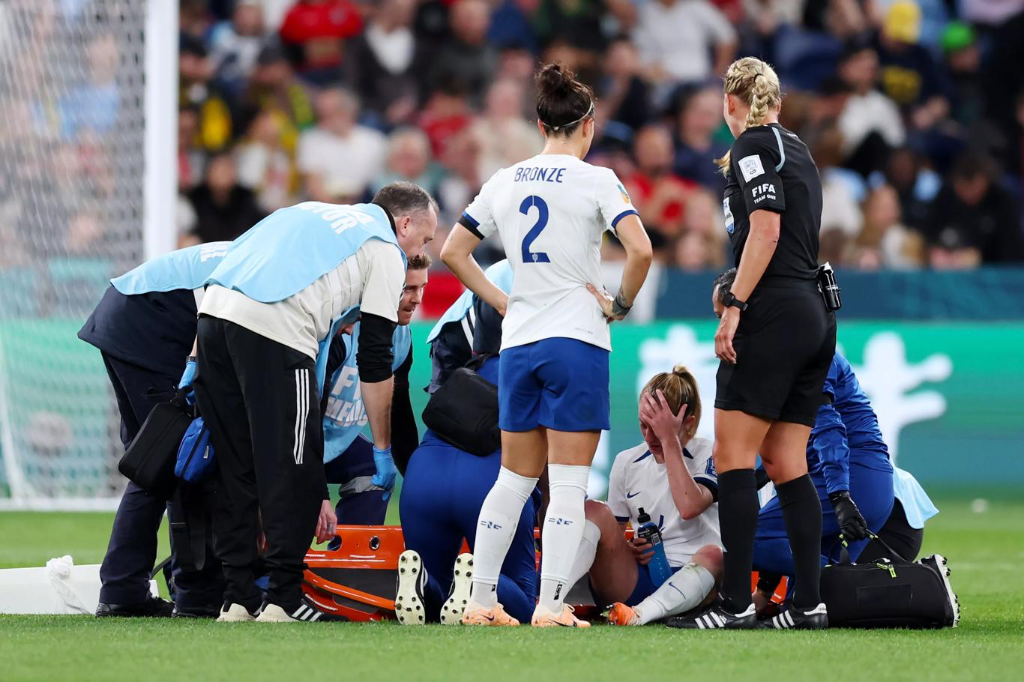 对阵丹麦队的比赛中,沃尔什(右三)膝盖受伤。图片来自国际足联官网