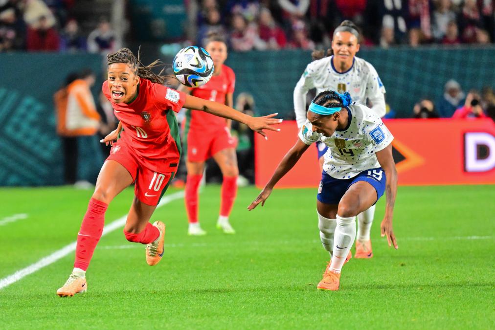 8月1日,葡萄牙队球员杰茜卡·席尔瓦(左)与美国队球员邓恩拼抢。新华社记者 朱炜 摄