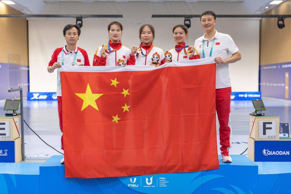 8月1日,冠军中国队选手熊亚瑄(左二)、林雅茜(中)、王珂怡(右二)在颁奖仪式结束后与教练合影。新华社记者黄伟摄