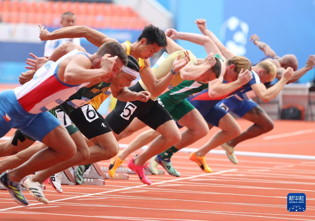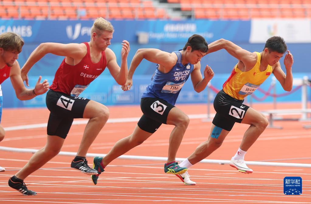 8月2日,中国选手陈业森(中)在男子十项全能100米比赛中。新华社记者 王曦 摄