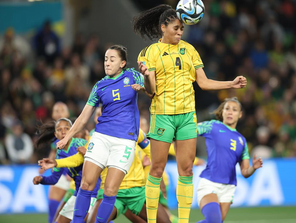 8月2日,巴西队球员卢瓦纳(左)与牙买加队球员尚泰勒·斯瓦比争顶。新华社记者丁旭摄