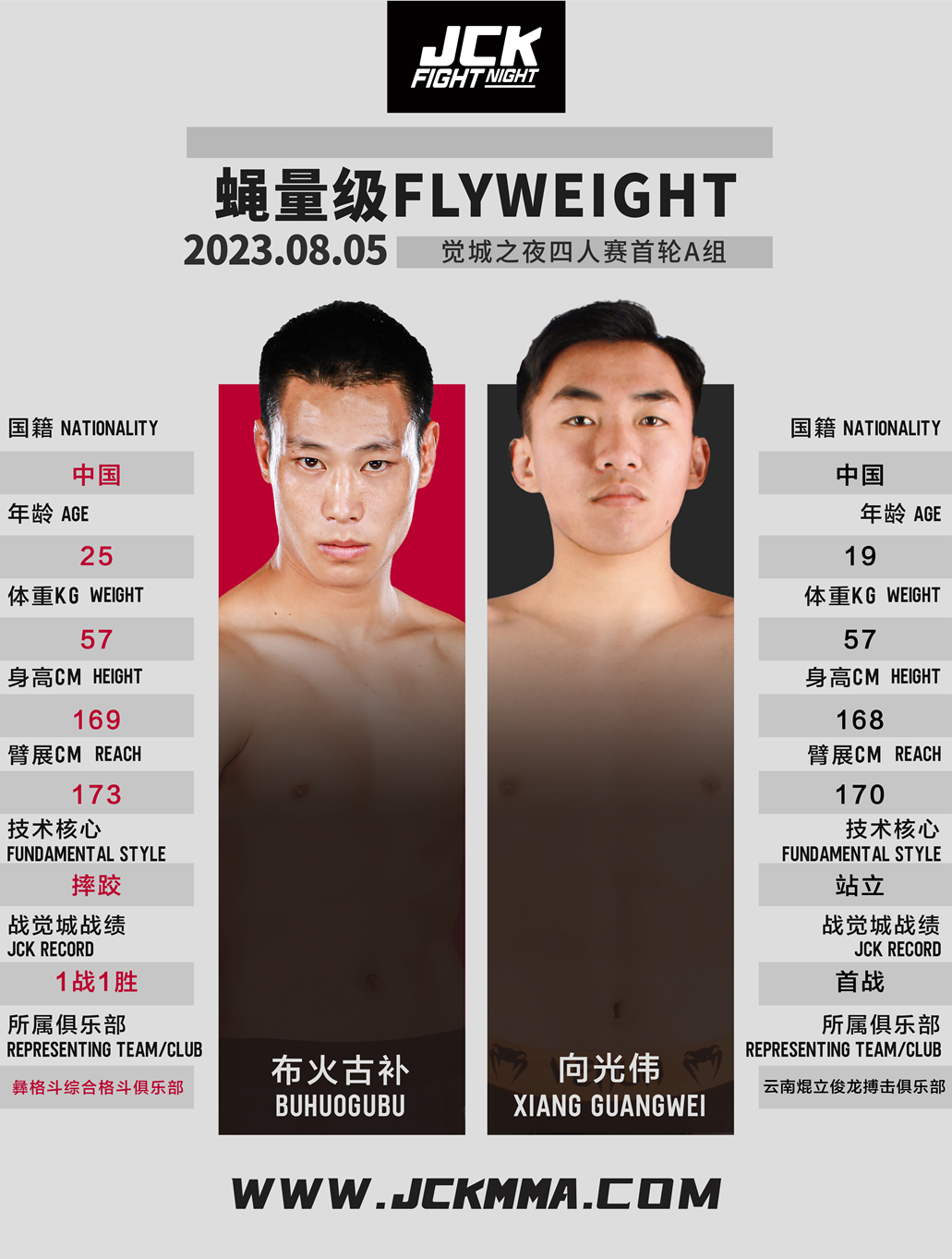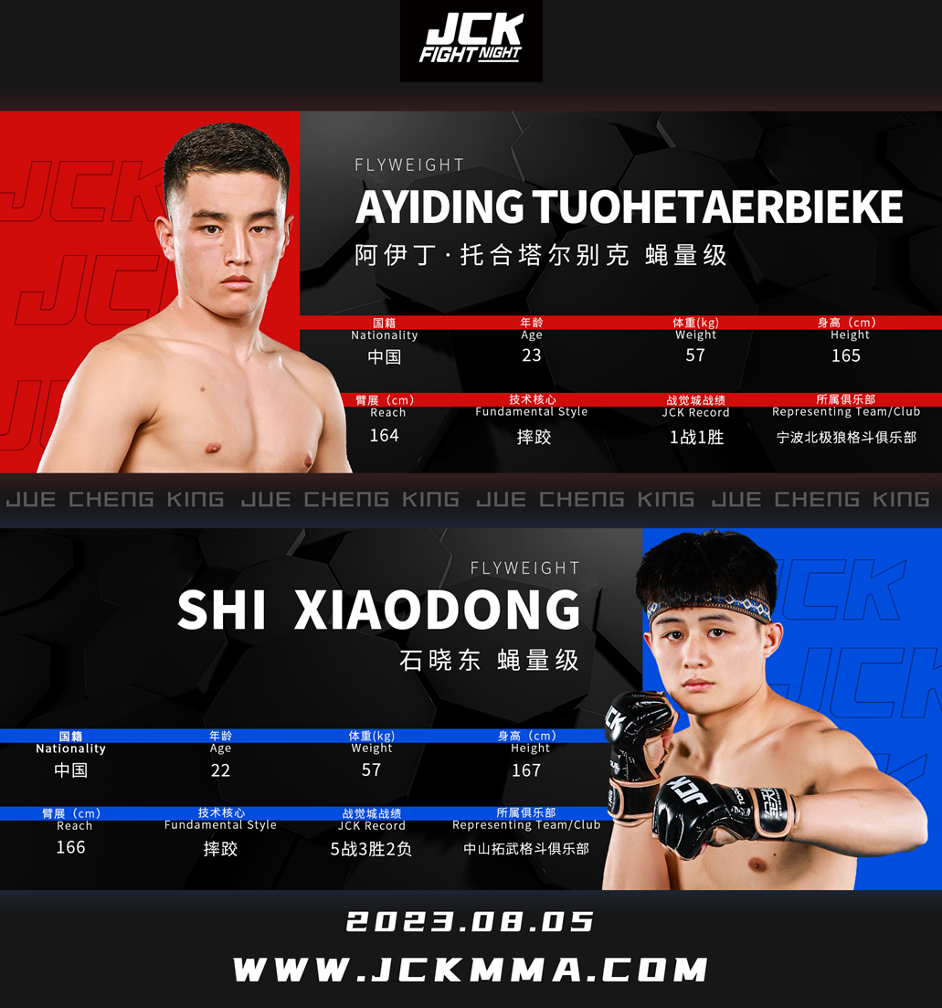 2023年8月5日,JCK觉城之夜 N66“初露锋芒”即将打响,阿伊丁·托合塔尔别克与石晓东领衔头条主赛,萨迪尔·图尔迪阿吉与拉赫米丁·贝科夫出战联合主赛,还有两场主赛阵容,分别为吉木五沙VS文允斌、杨飞VS白国庆。四人锦标赛首轮争夺阵容为布火古补VS向光伟、 阿弟VS米尔佐别克·乌马罗夫,除此以外还有1场女子副赛。