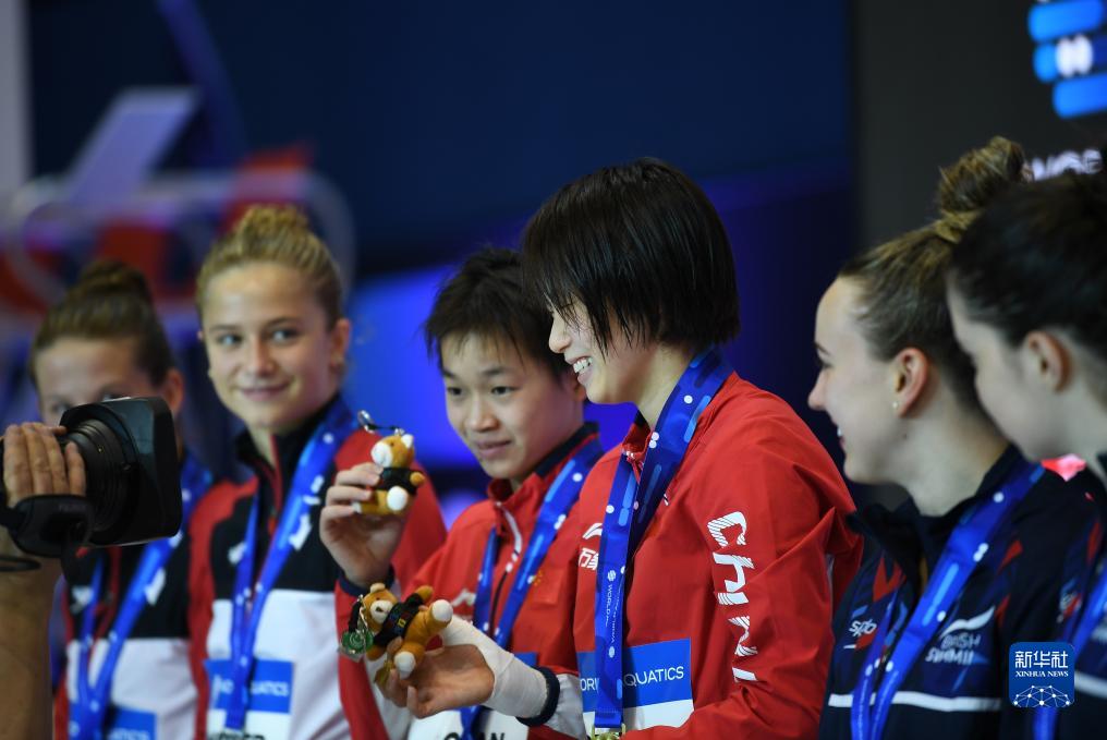 8月4日,陈芋汐(右三)/全红婵(右四)在颁奖仪式上。新华社记者 任鹏飞 摄