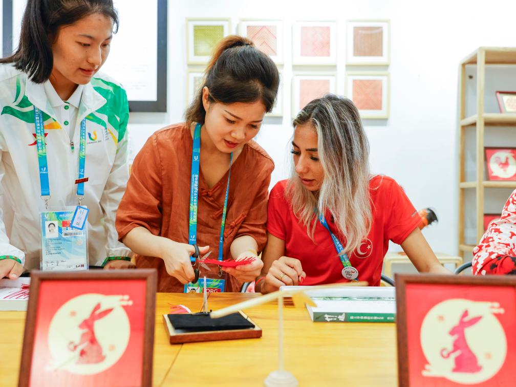 其中,非遗互动体验是众多文化活动的重头戏。在大运村互动体验中心,运动员和教练员在休息时间纷纷前来跟随蜀绣、竹编、剪纸等非遗项目传承人近距离了解中国非遗文化。