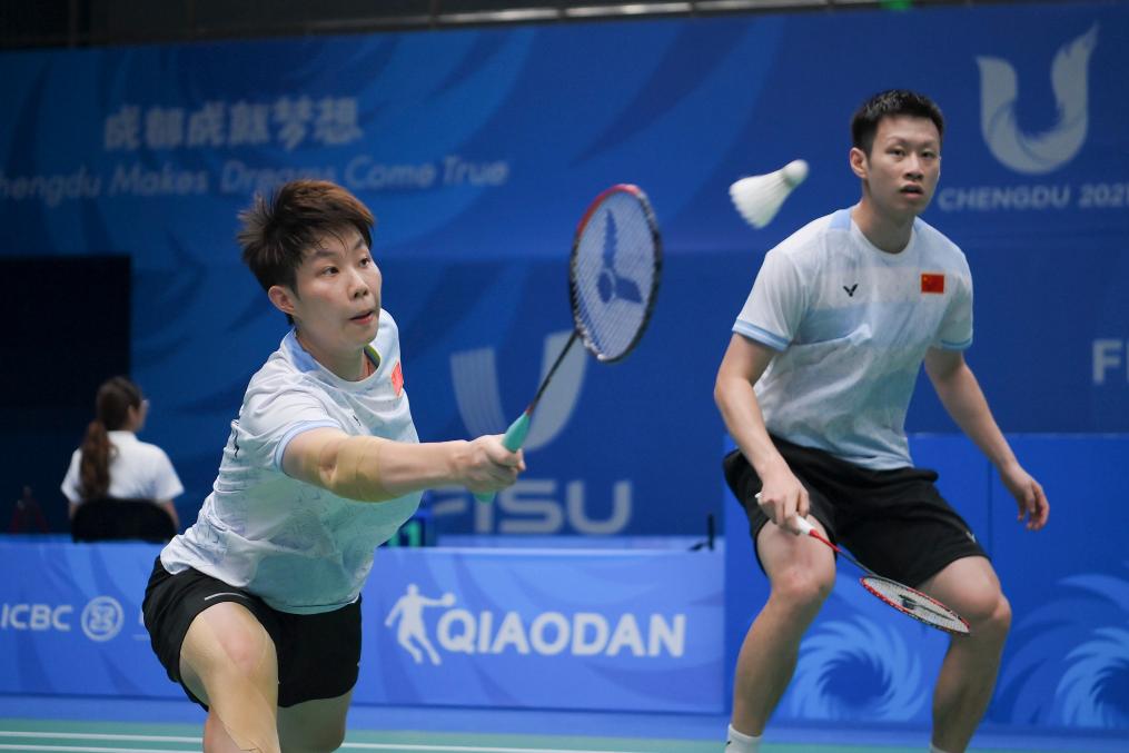 8月4日,任翔宇(右)/刘玄炫在比赛中。当日,在成都大运会羽毛球混合双打第一轮比赛中,他们以2:0战胜法国组合罗西/瓦莱,晋级下一轮。新华社记者张端摄