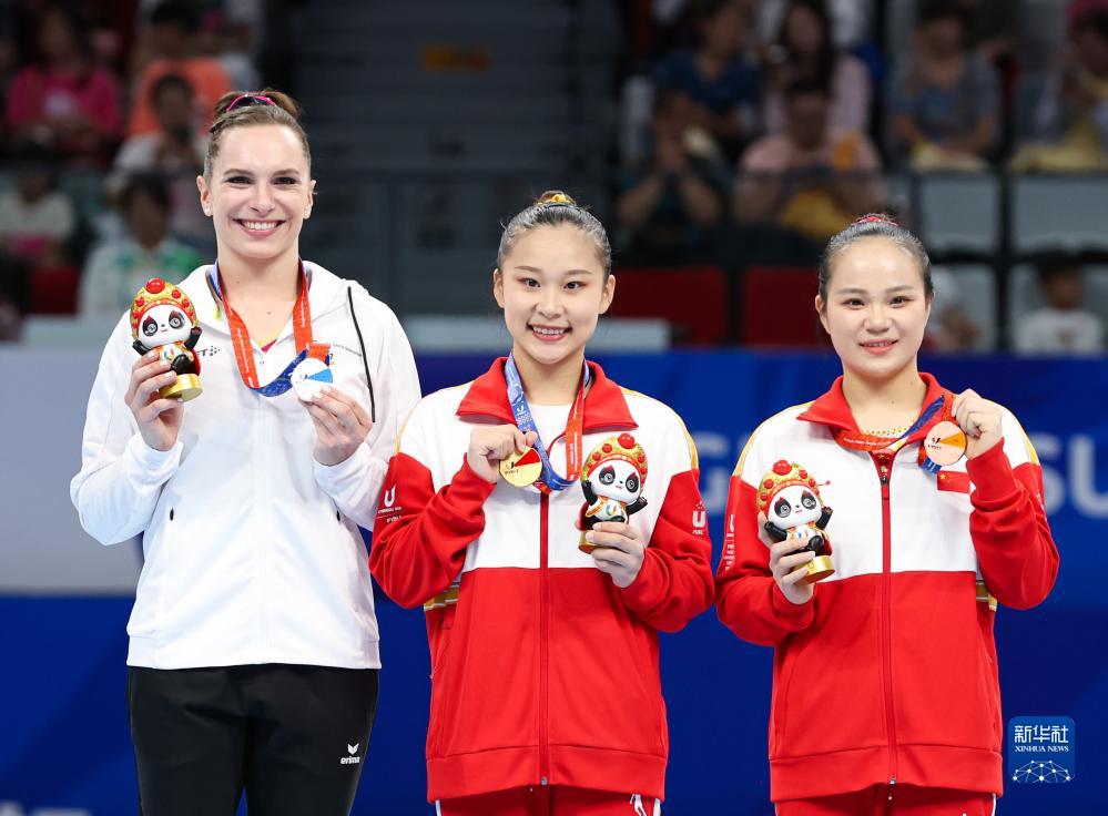 8月5日,冠军中国选手杜思雨(中)、亚军德国选手斯切德(左)和季军中国选手罗欢在颁奖仪式上合影。新华社记者 王婧嫱 摄