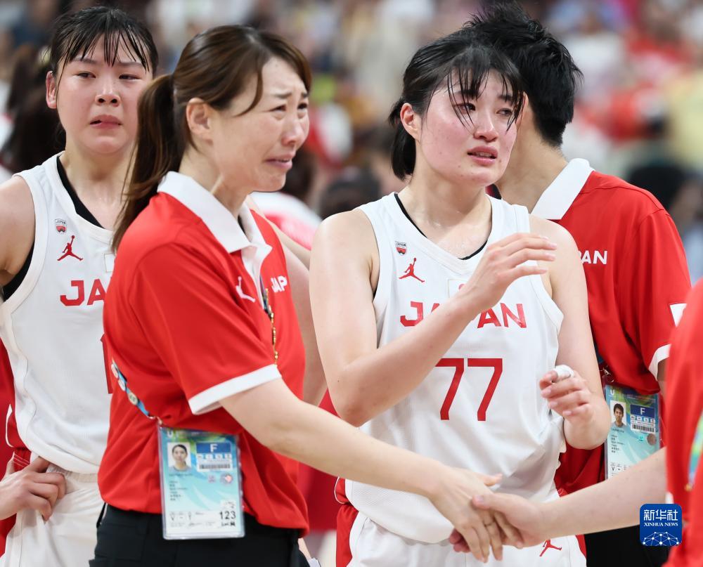 8月5日,日本队球员冈本美优(右)赛后哭泣。新华社记者 兰红光 摄