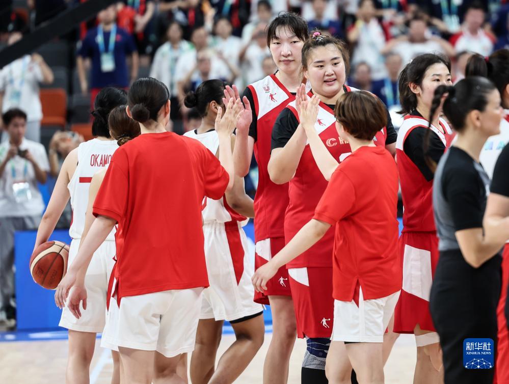 8月5日,中国队球员(后)在比赛结束后和日本队球员击掌致意。新华社记者 胡超 摄