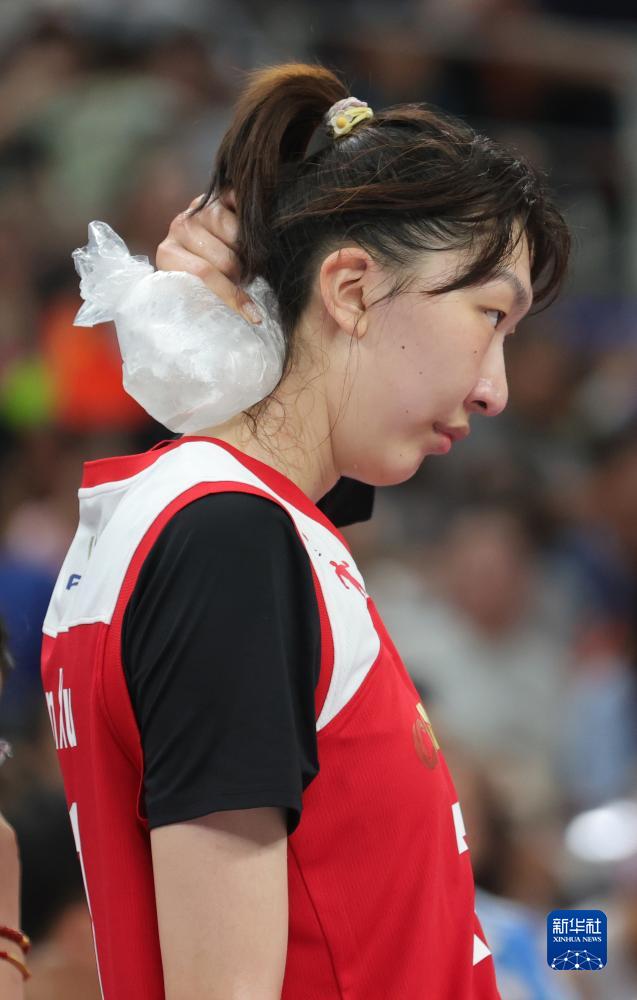 8月5日,中国队球员韩旭敷冰袋降温。新华社记者 杨青 摄