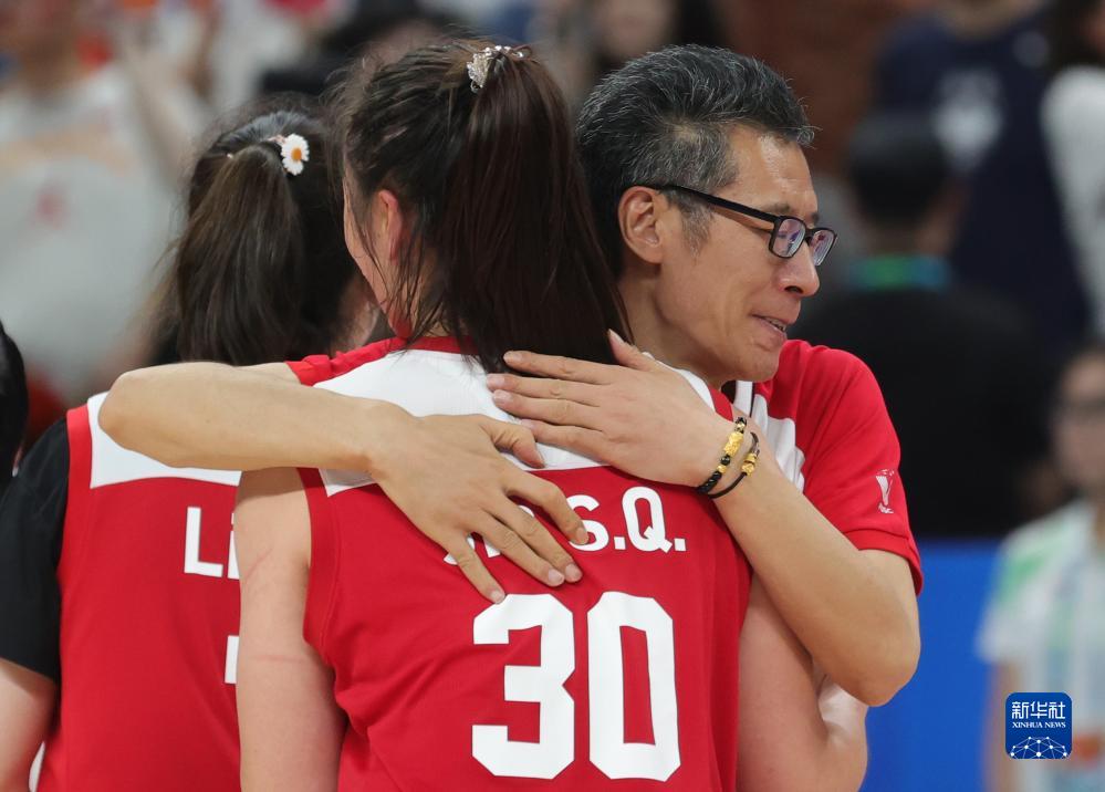 8月5日,中国队主教练李笋南(右)在比赛后拥抱球员贾赛琪。新华社记者 杨青 摄