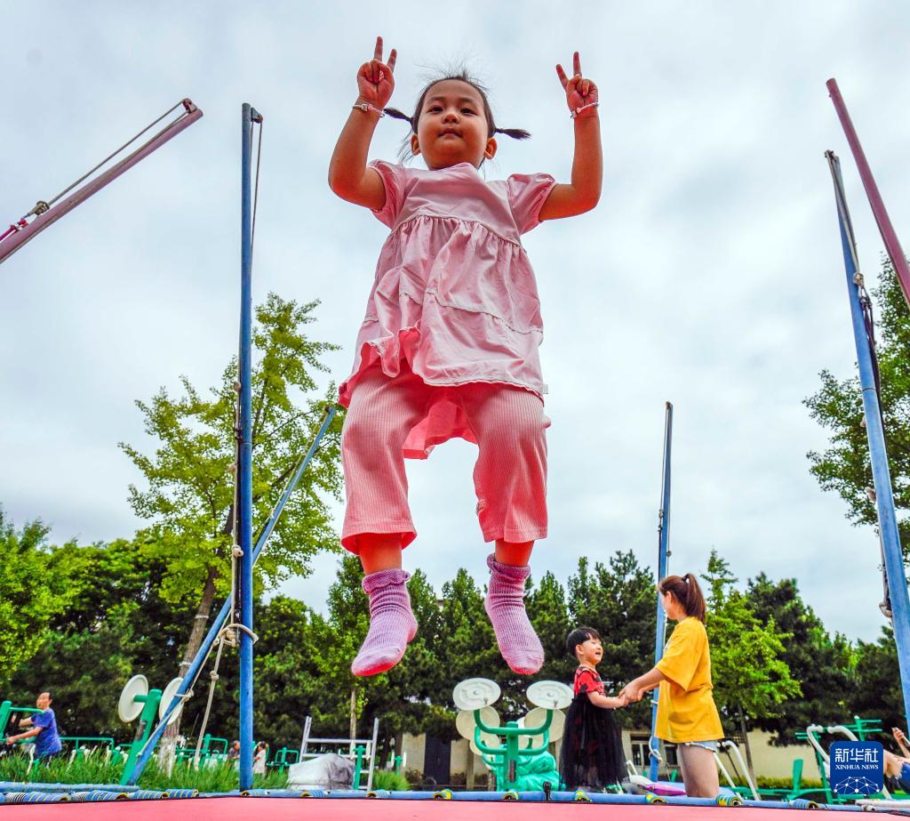8月6日,一名小朋友在河北省遵化市人民公园跳“蹦蹦床”。新华社发(刘满仓摄)