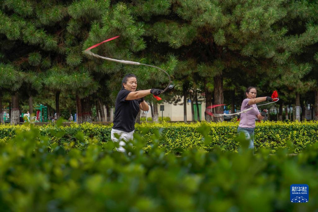 8月6日,市民在河北省遵化市人民公园练习健身鞭。新华社发(刘满仓摄)