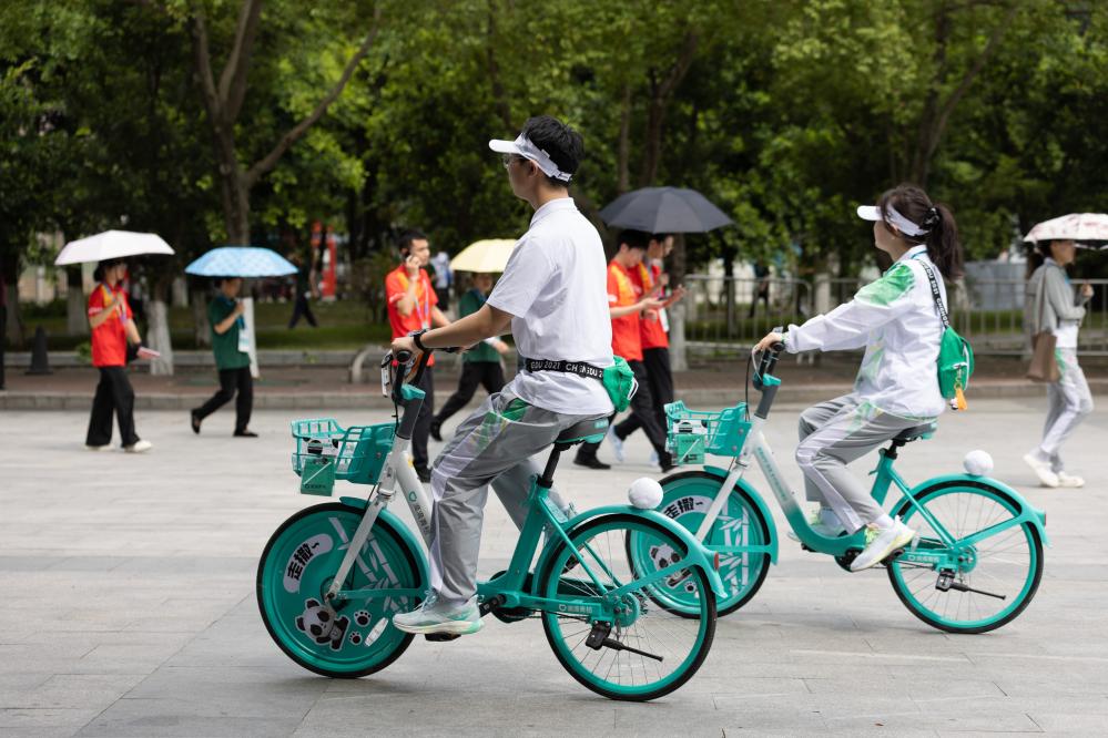 7月20日,志愿者骑着大运会定制共享单车行驶在成都大学校园内。新华社记者江宏景摄