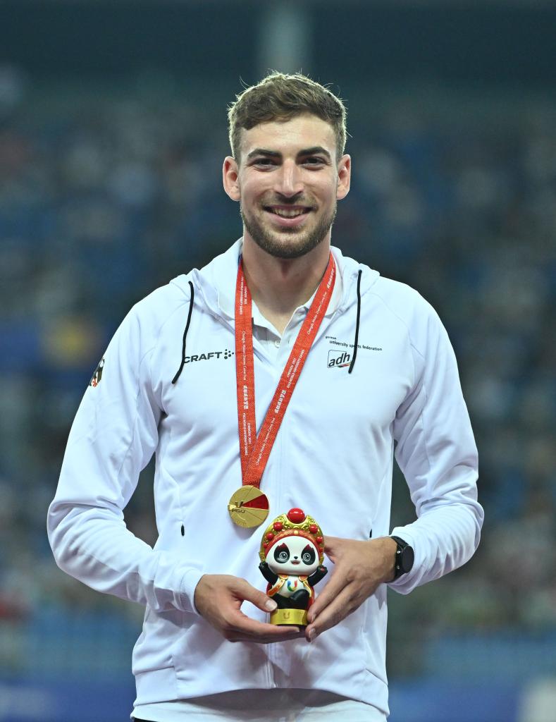 德国田径运动员延斯·默根特勒在男子3000米障碍赛中摘金。“我一到这里就看到了‘成都成就梦想’这个口号。”他说,“观众的鼓舞让我尽全力争夺金牌,最终实现梦想。”