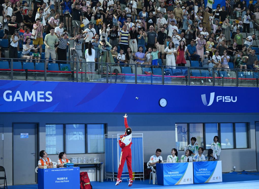 8月3日,张雨霏在颁奖仪式后将吉祥物抛给观众。当日,在成都举行的第31届世界大学生夏季运动会女子100米自由泳决赛中,中国选手张雨霏以53秒34的成绩获得冠军。新华社记者吴刚摄