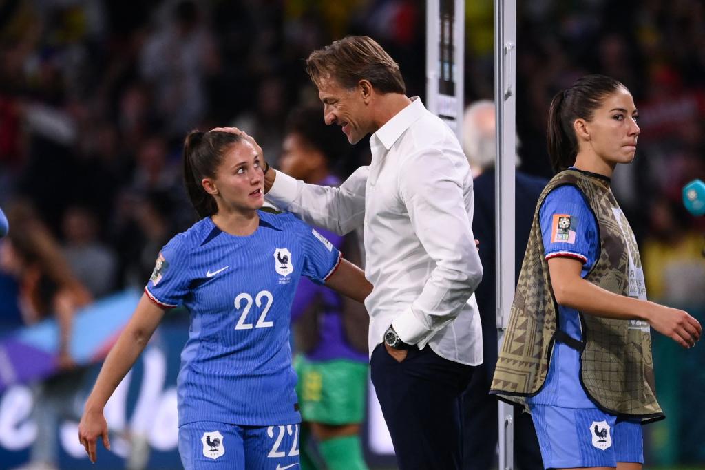 7月29日,法国队主教练勒纳尔(中)在赛后与佩里塞交流。新华社发