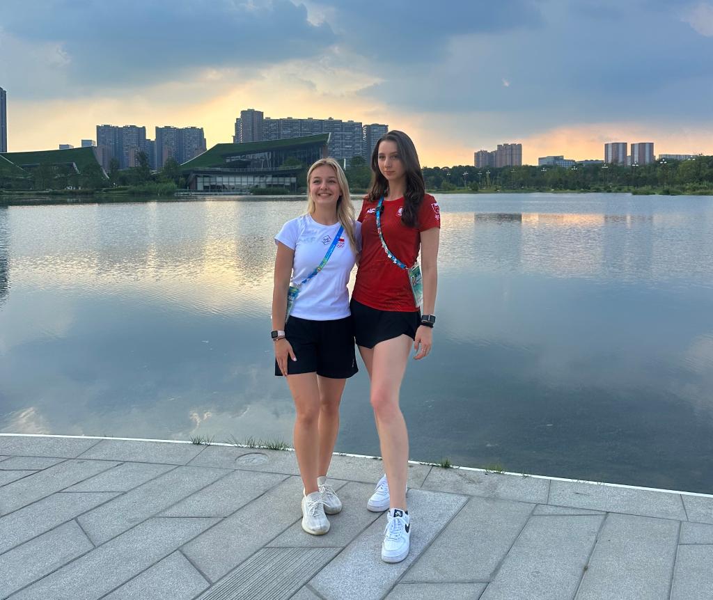 8月1日,参加成都第31届世界大学生夏季运动会的波兰击剑运动员亚历山大·耶格林斯卡和多米妮卡·瓦西尔丘克在天府艺术公园合影。新华社记者徐晓蕾摄