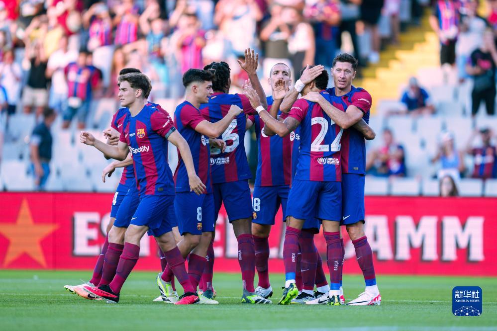 8月8日,巴塞罗那队球员在比赛中庆祝进球。新华社发(胡安·戈萨摄)