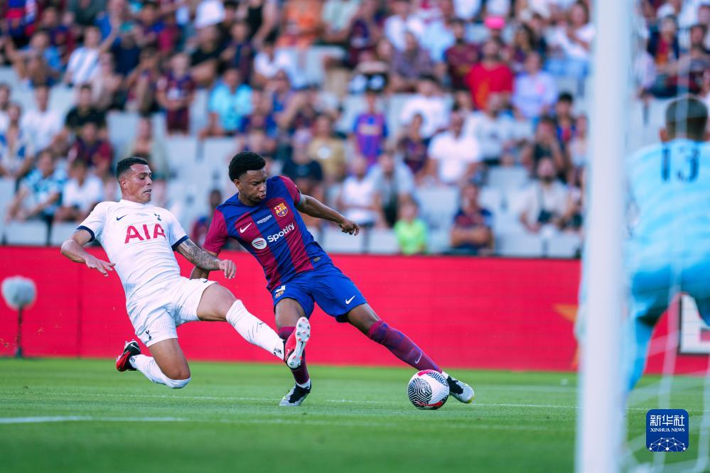 8月8日,巴塞罗那队球员巴尔德(右)与热刺队球员波罗在比赛中拼抢。新华社发(胡安·戈萨摄)