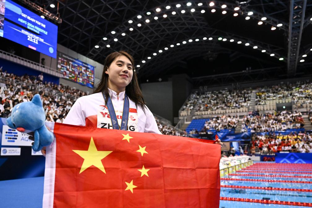 7月24日,张雨霏在颁奖仪式后。当日,在日本福冈举行的2023年世界游泳锦标赛女子100米蝶泳决赛中,中国选手张雨霏以56秒12的成绩夺得冠军。新华社记者许畅摄