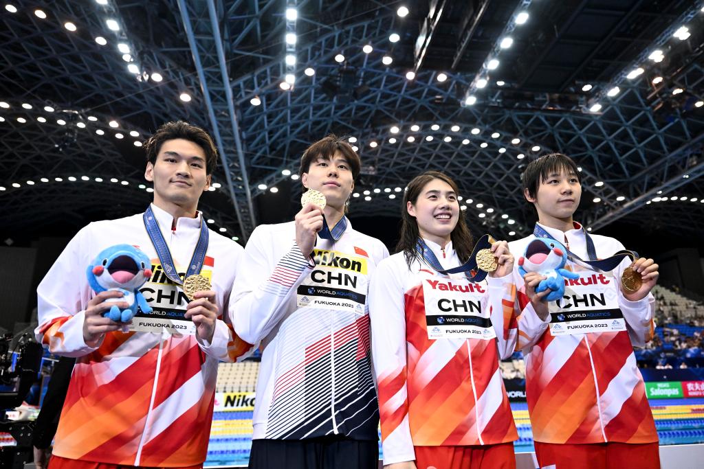 7月26日,中国队选手徐嘉余、覃海洋、张雨霏与程玉洁(从左至右)在颁奖仪式后合影。当日,在日本福冈举行的2023年世界游泳锦标赛男女4x100米混合泳接力决赛中,中国队获得冠军。新华社记者许畅摄