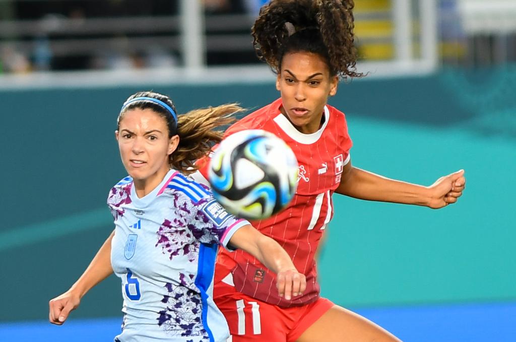 8月5日,西班牙队球员艾塔纳·邦马蒂(左)与瑞士队球员孔巴·索乌在比赛中拼抢。新华社记者郭磊摄