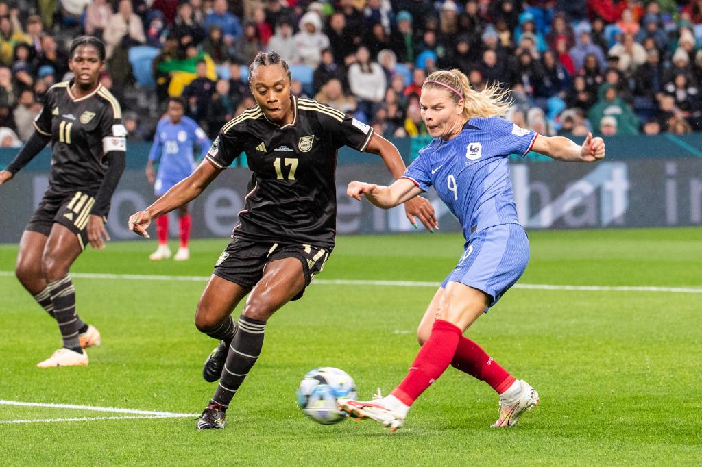 7月23日,法国队球员勒佐默(右)与牙买加队球员阿莉森·斯瓦比在比赛中拼抢。当日,在女足世界杯F组小组赛中,法国队以0:0战平牙买加队。新华社发(胡泾辰摄)