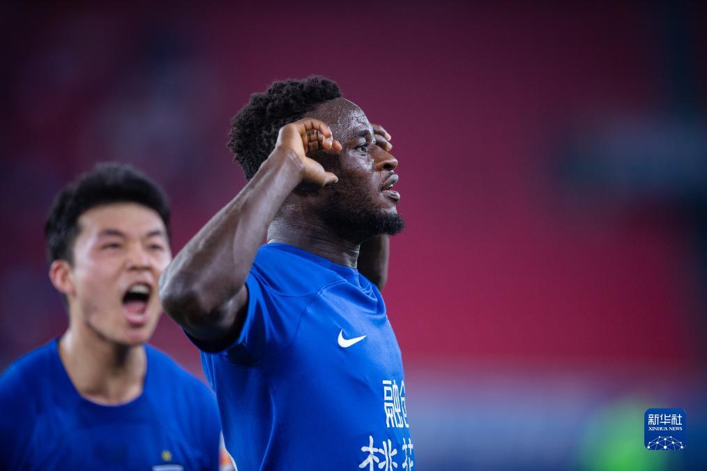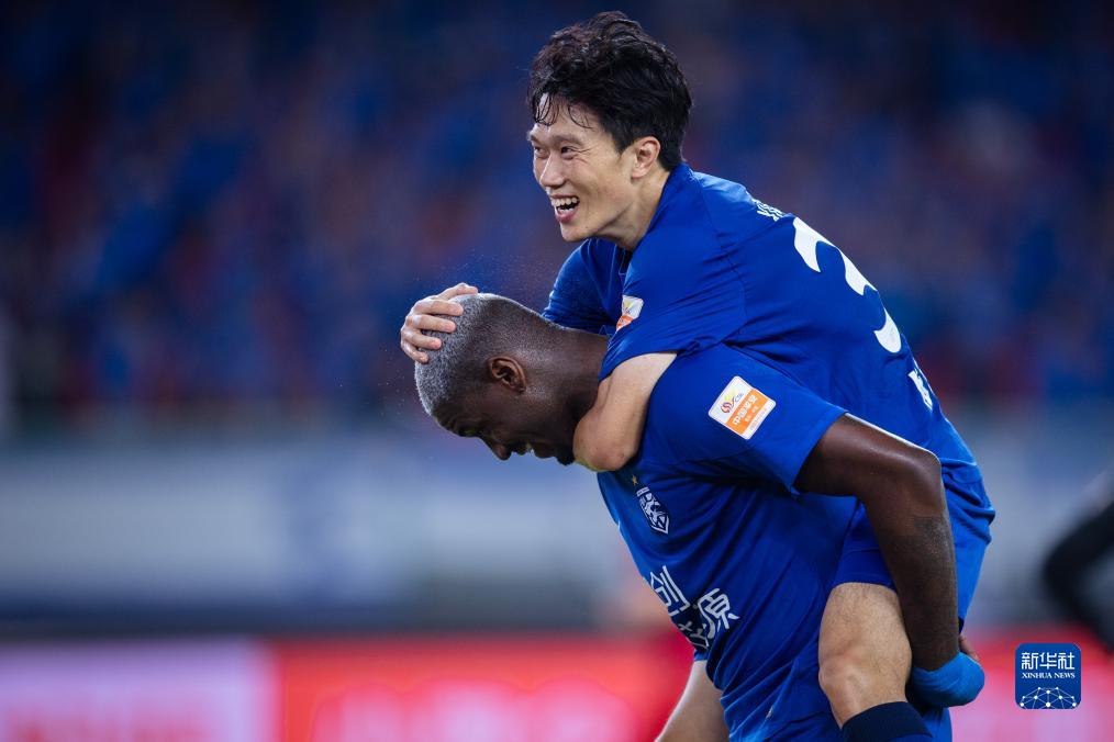 8月9日,武汉三镇队球员阿齐兹(右)在进球后庆祝。新华社记者 伍志尊 摄