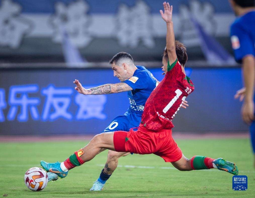 8月9日,武汉三镇队球员戴维森(上)和河南队球员罗歆在比赛中拼抢。新华社记者 伍志尊 摄
