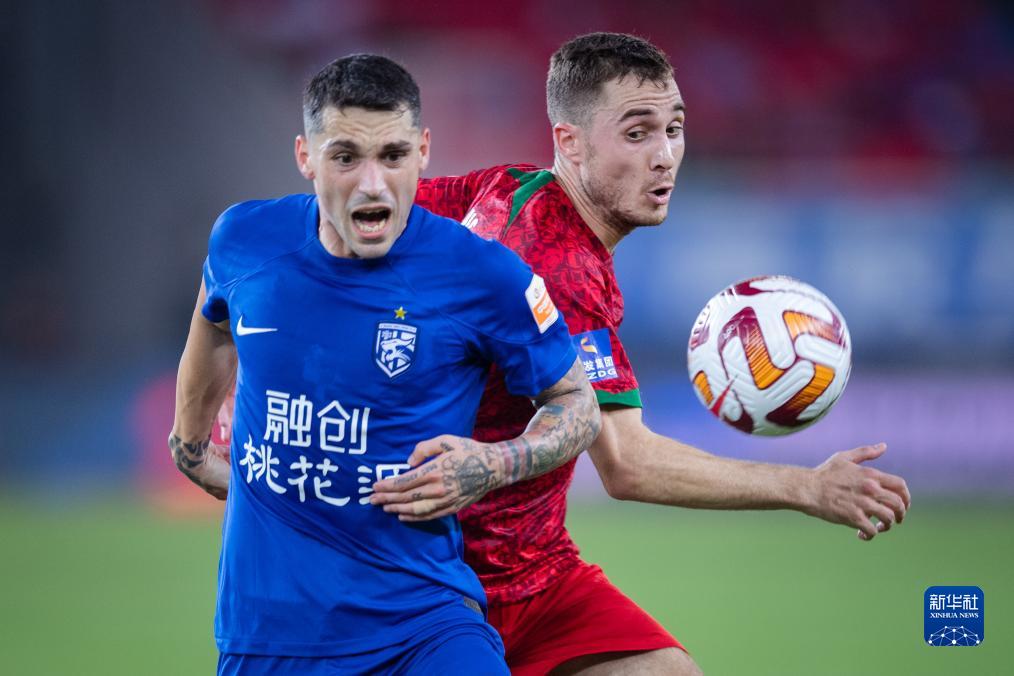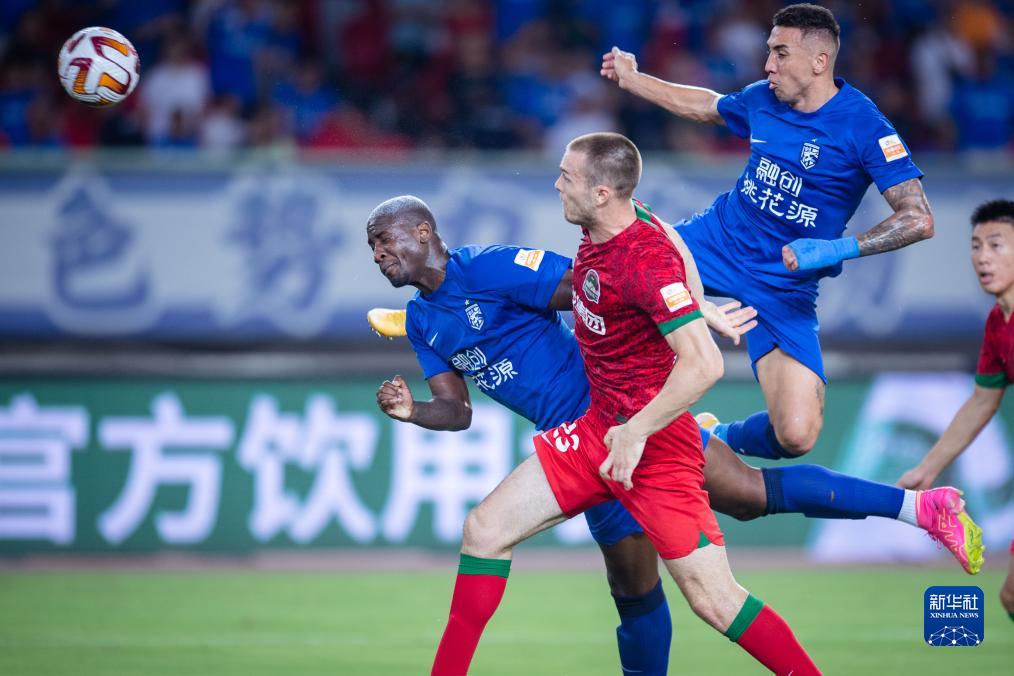 8月9日,武汉三镇队球员斯坦丘(左一)在比赛中射门。新华社记者 伍志尊 摄