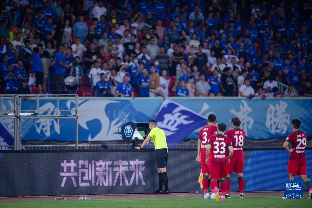 8月9日,主裁判傅明(左一)在比赛中查看VAR后,判定武汉三镇队进球有效。新华社记者 伍志尊 摄