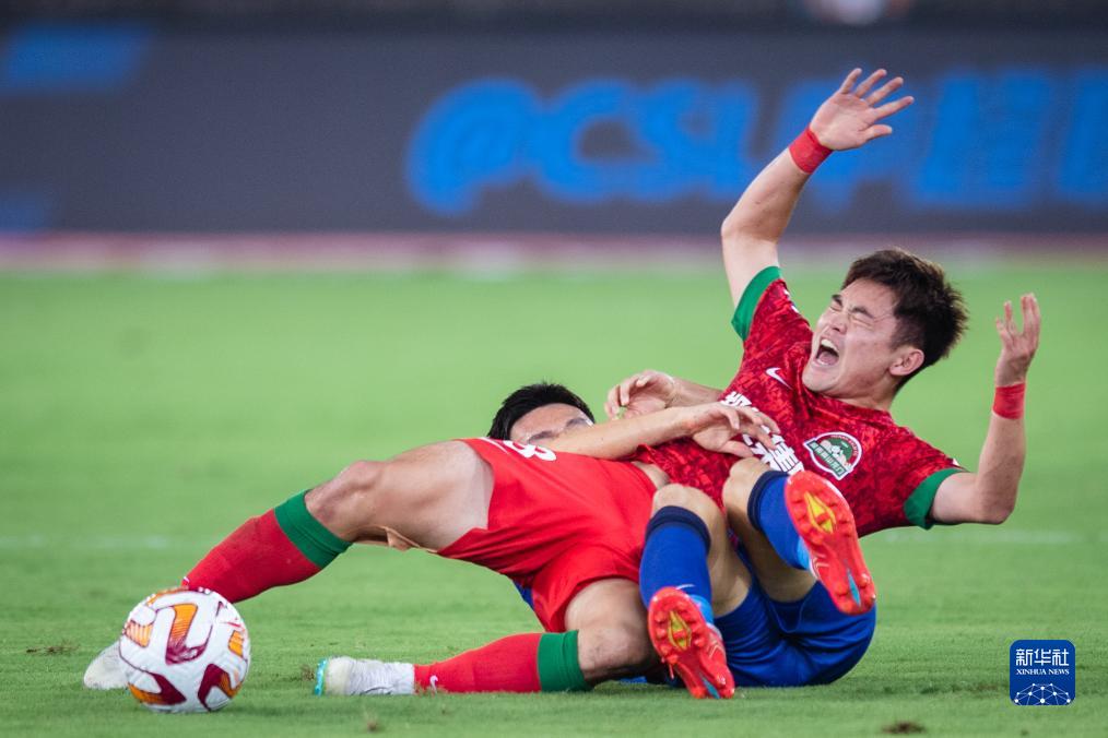 8月9日,河南队球员黄紫昌(上)在比赛中拼抢摔倒。新华社记者 伍志尊 摄
